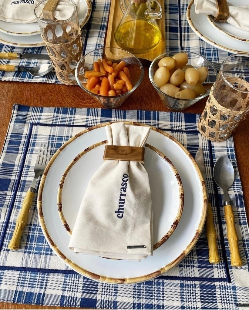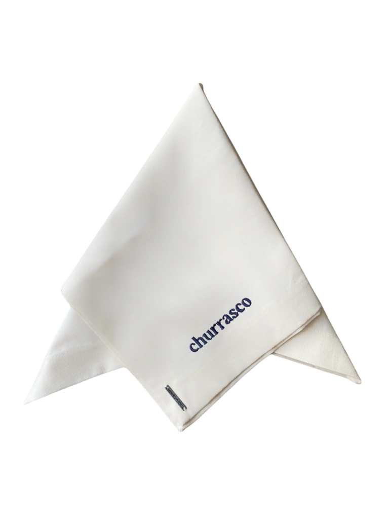 Guardanapo de sarja cru bordado churrasco azul marinho. Composição: Sarja 100% algodão Medidas: 45cm x 45cm