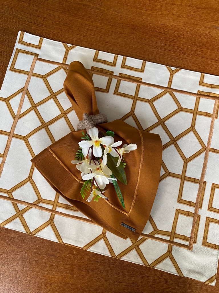 Guardanapo liso em tecido sarja caramelo com acabamento barra bordada.