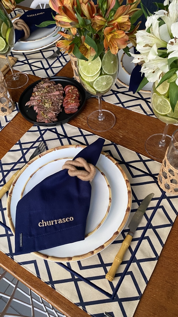Jogo americano dupla face impermeável, estampa geométrica azul marinho e fundo bege. O outro lado do jogo americano são listras brancas, azul marinho e azul royal e com acabamento bordado ponto cheio por todo contorno do jogo americano.