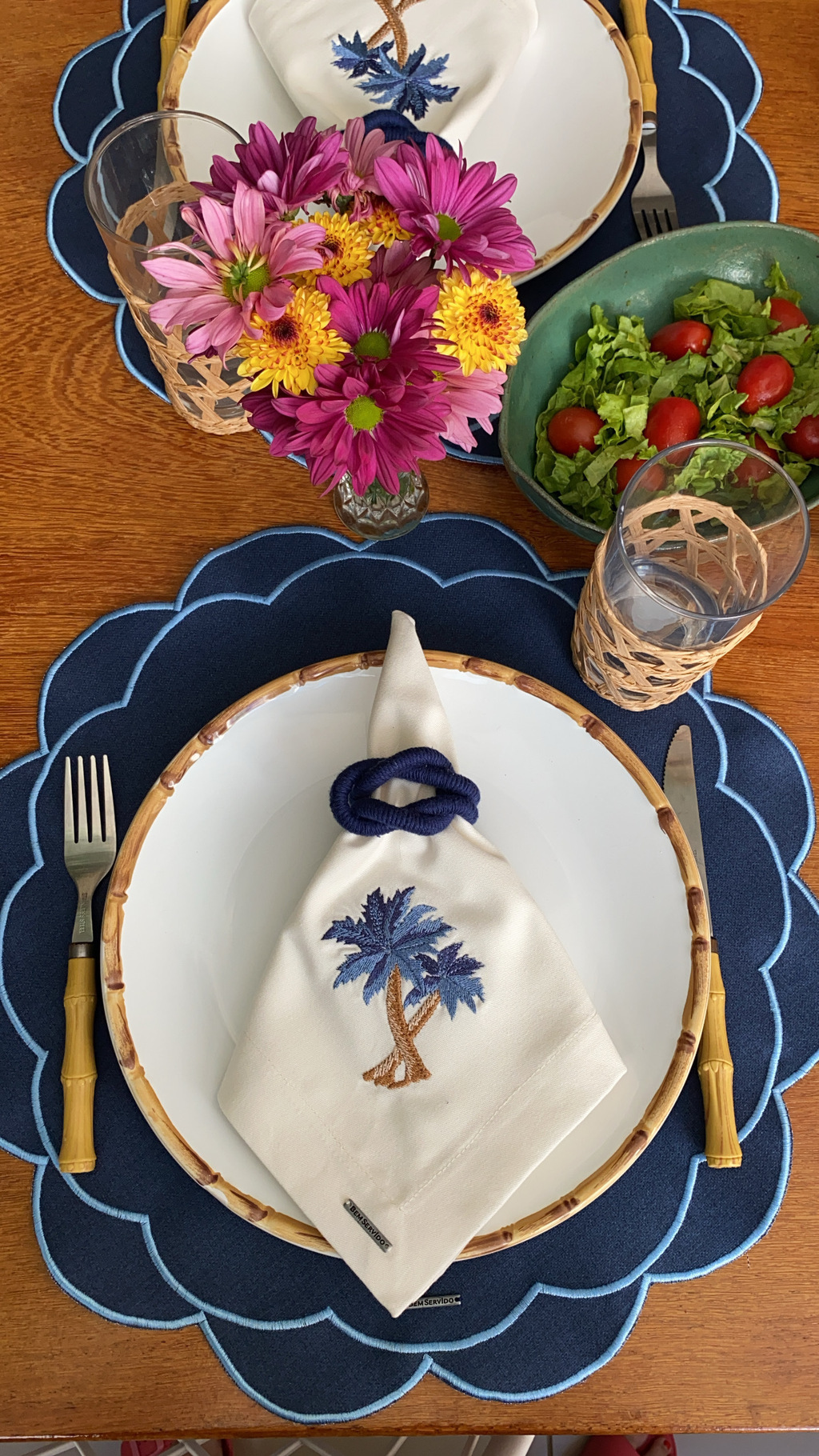 Jogo americano impermeável Flora azul marinho, bordado com 2 pontos cheios azul claro por todo contorno da peça.