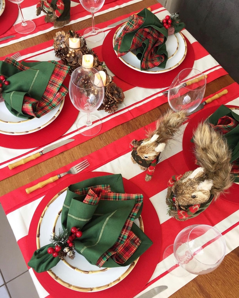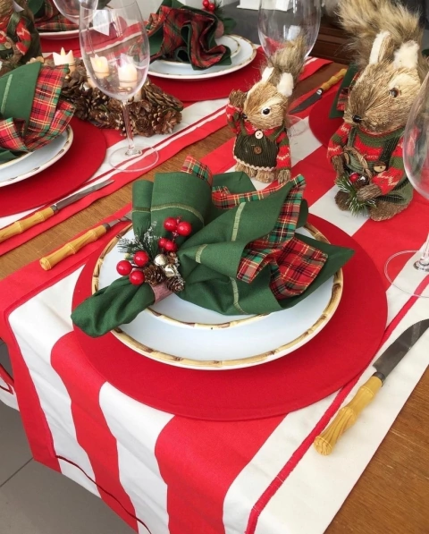 Trilho com bordado ponto cheio em sarja, tecido semi impermeável estampa listras vermelho e branco.
